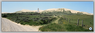 Ein Jahr später reichte es zeitlich leider nur für einen kleinen Zwischenstopp an der Hauptstraße in der Nähe des Leuchtturms. Nebenbei entstand das nachfolgende Panorama, welches ich erst im Jahr 2010 beim Durchstöbern meines scanpics-Archivs wieder entdeckte. Die Flugsanddüne befand sich zu dieser Zeit noch deutlich sichtbar hinter dem Leuchtturm im meerseitigen Bereich.