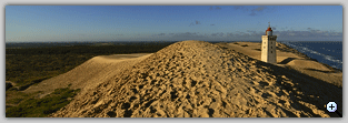 Mittags ist es praktisch unmöglich, auf der Flugsanddüne Panoramen zu fotografieren, ohne dass einem begeisterte, staunende oder fotografierende Touristen durch das Bild laufen. Das gehört aber dazu, denn der Leuchtturm ist inzwischen eine der meistbesuchten Touristenattraktionen in Nordjütland. Wem das zu belebt ist, der sollte lieber auf den frühen Morgen ausweichen, denn auch abends zum Sonnenuntergang kann es recht "voll" werden beim Leuchtturm ...