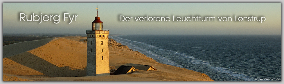 Als Standort für den Leuchtturm wählte man den derzeit höchsten Punkt der Steilküste zwischen Lønstrup und Løkken. Diese rundliche Erhöhung (= Knude) lag 60 Meter über dem Meer und befand sich zu jener Zeit ca. 200 Meter landeinwärts. Nur eine kleine ca. 2-3 Meter hohe Düne befand sich zwischen dem Leuchtturmkomplex und dem Meer. Bereits 10 Jahre nach der Inbetriebnahme des Leuchtturms fingen jedoch die Probleme an. Große Mengen Sand wurden an der Steilküste den Hang hinauf geweht und lagerten sich ausgerechnet zwischen Steilküste und Leuchtturm ab. Nach weiteren 10 Jahren (1920) verteilte sich der Flugsand nunmehr über das gesamte Leuchtturmgelände und um die Gebäude. Der Brunnen versandete und die Gemüsegärten wurden im wahrsten Sinne verwüstet. Der Kampf mit dem Sand dauerte weitere 30 Jahre. Versuche die Flugsanddüne an der höchsten Stelle abzutragen (1950) blieben erfolglos. Immer wieder wurden unglaubliche Mengen Flugsand die Steilküste hinaufgeweht. Auch das Bepflanzen der Düne mit Strandhafer ließ die Flugsanddüne nur noch schneller wachsen. Vom Meer aus war der Leuchtturm mittlerweile aus verschiedenen Richtungen nicht mehr zu sehen. Da im Laufe der Zeit die Seenavigation immer moderner wurde und der Kampf gegen das Sandtreiben nicht zu gewinnen war, wurde der Leuchtturm Rubjerg Fyr im Jahr 1968 aufgegeben und für immer abgeschaltet. Im Jahr 1980 wurde der Leuchtturmkomplex als Flugsandmuseum dem 'Vendsyssel Historiske Museum' unterstellt. In den Gebäuden befanden sich Ausstellungen über die Geschichte des Leuchtturms, sowie Erläuterungen zum Flugsandproblem. Ein weiteres Gebäude wurde zur Cafeteria umfunktioniert. Ab 1992 wurden alle Maßnahmen unterlassen, den Sand von den Ausstellungsgebäuden fern zu halten. Seitdem verschlang der Sand nach und nach alle Gebäude des Leuchtturms. |